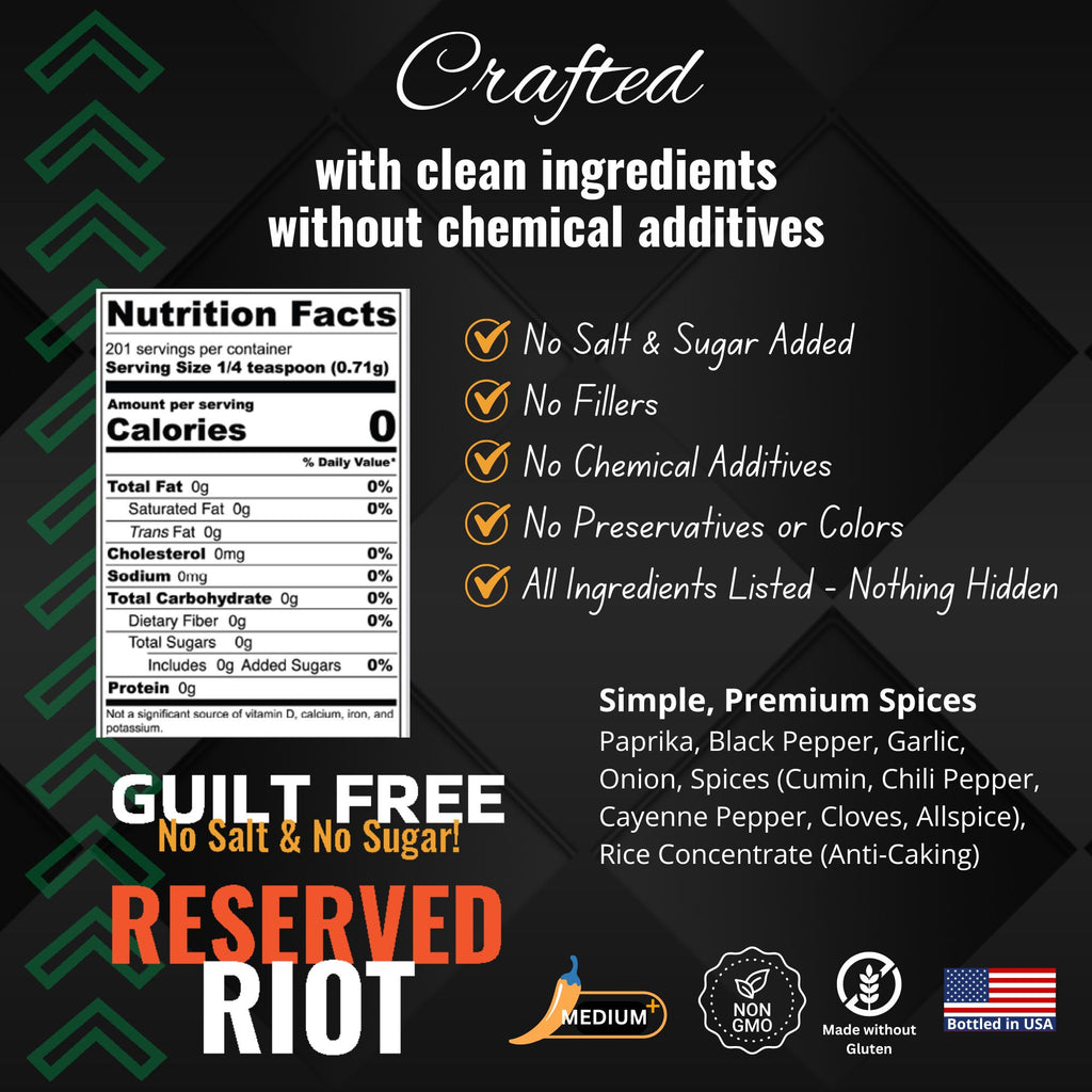 Guilt Free Reserved Riot (Medium Spicy) -A bold, guilt-free blend crafted without salt or sugar, made for those who want clean ingredients with a touch of heat. This medium-spicy seasoning delivers lively flavor and a gentle kick while keeping your cooking simple and balanced. Its vibrant taste comes naturally from carefully selected spices, creating a layered, satisfying flavor without relying on salt or sugar.